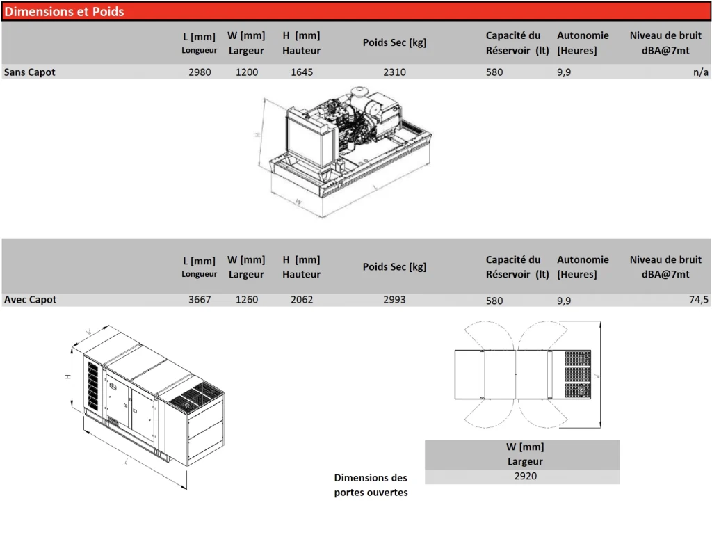 Le groupe électrogène diesel ARK-B 320 L5, fabriqué par Arken Power Solutions, délivre 280 kVA en puissance prime et 315 kVA en puissance de secours, offrant des performances exceptionnelles pour les applications en fonctionnement continu et de secours. Équipé du moteur Baudouin 6M16G300/5 à 6 cylindres, turbocompressé et refroidi par eau, il garantit un fonctionnement fluide, une consommation de carburant optimisée et une longue durée de vie. Son alternateur LINZ PRO28S D/4, doté d’un régulateur de tension électronique AVR, assure une régulation stable de la tension avec une précision de ±1 % et un THD < 3,1 %, garantissant une énergie propre et constante. Conçu conformément aux normes ISO 8528 et ISO 3046, le ARK-B 320 L5 fonctionne à un faible niveau sonore de 74,5 dBA, dispose d’un capot compact et résistant aux intempéries, et bénéficie d’une garantie de 2 ans ou 1000 heures, assurant durabilité et fiabilité dans les environnements exigeants.