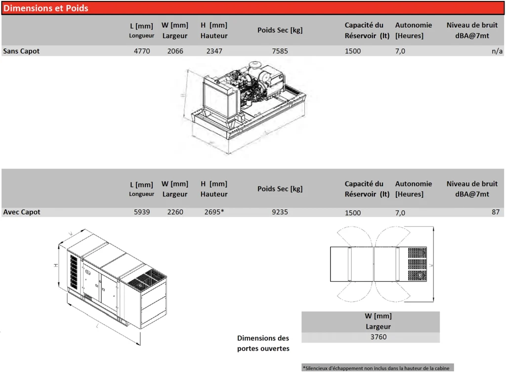 Avec 1020 kVA prime et 1125 kVA standby, son moteur Perkins 4008-TAG2A et son alternateur STAMFORD S6L1D-E4, il délivre une énergie propre, stable et hautement performante pour les applications industrielles intensives.