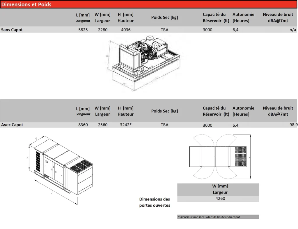 Conforme aux normes ISO 8528, fonctionnant à 98,9 dBA et garanti 2 ans / 1000 heures, il constitue une solution robuste, fiable et conçue pour une production d’énergie continue ou de secours à grande échelle.