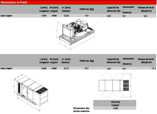 Certifié ISO 8528, silencieux à 71,7 dBA et garanti 2 ans / 1000 heures, il assure une fiabilité durable pour les applications industrielles continues.